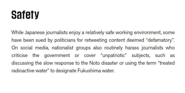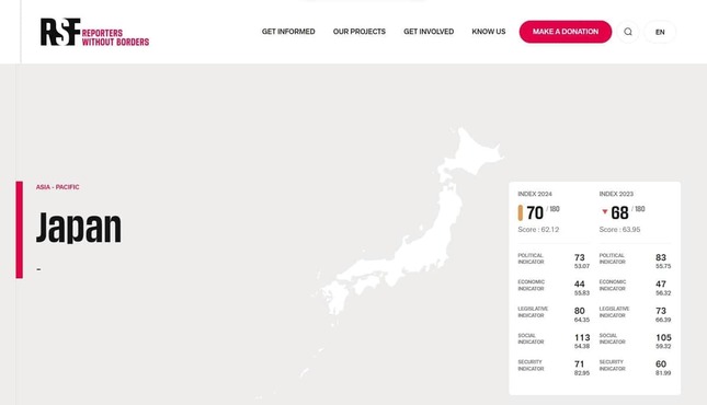 「日本は議会制民主主義国家であり、メディアの自由と多元主義の原則は総じて尊重されている。しかし、伝統的な利害関係やビジネス上の利害関係、政治的圧力、男女間の不平等によって、ジャーナリストが監視者としての役割を完全に果たすことがしばしばできなくなっている」