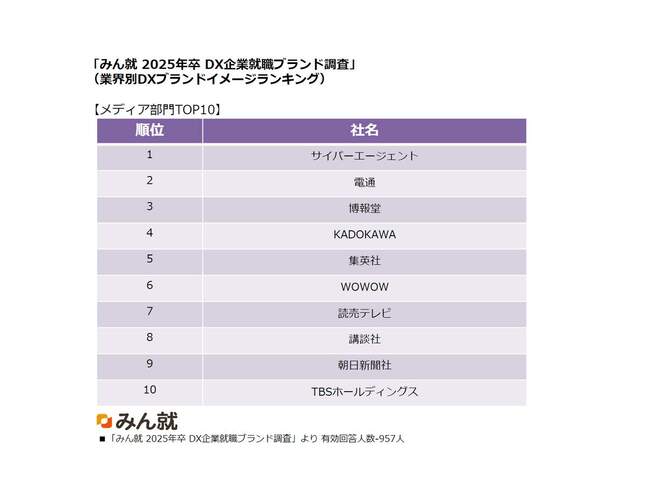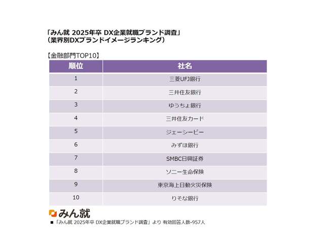 就活生のイメージ調査は正しいのか? 口コミ就職情報サイトを運営するみん就は2024年4月12日、「DX企業就職ブランド調査」の結果を公表した。「メーカー」「金融」「インフラ」「メディア」「不動産」の5業界におけるDXブランドイメージランキングを算出、TOP10をランキング化している。