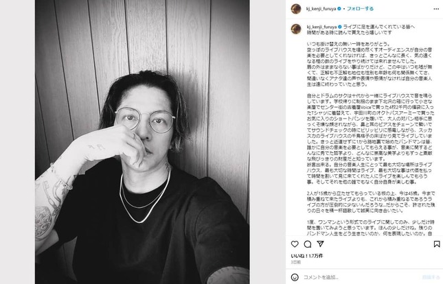 2バンドのワンマンツアー真っ最中の降谷さんだが、2日にインスタグラムで「ライブに足を運んでくれている皆へ 時間がある時に読んで貰えたら嬉しいです」と切り出し、ワンマンライブへの思いを長文でつづった。