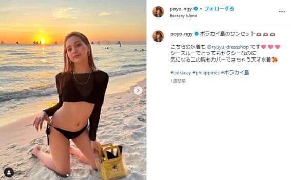 2024年4月23日の投稿では、ボラカイ島のサンセットを背景に黒の水着を着用したゆきぽよさんの姿が公開された。ファンからは、「夕陽よりゆきぽよにしか目がいかん」、「めっちゃ綺麗やしスタイル抜群やしセクシーやし美脚すぎる!足細くて長っ」、「女神降臨」などのコメントが寄せられている。
