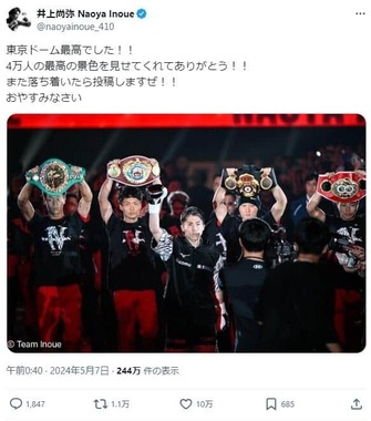 2024年5月6日に東京ドームで行われたボクシングの4団体統一世界スーパーバンタム級タイトルマッチで、王者の井上尚弥選手が挑戦者のルイス・ネリ選手を破り、防衛に成功した。