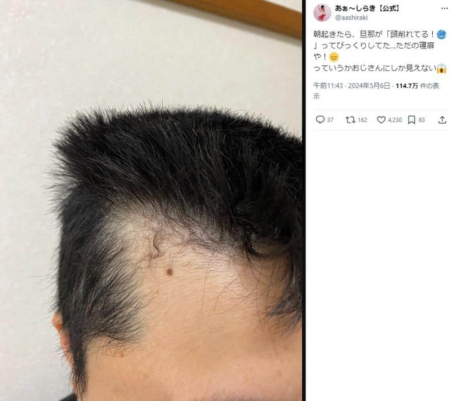 しらきさんはXで「朝起きたら、旦那が『頭削れてる!』ってびっくりしてた...ただの寝癖や」として、自身の寝起きの写真を公開した。向かって左側の髪だけが立ち上がり、断崖のような形になっている。