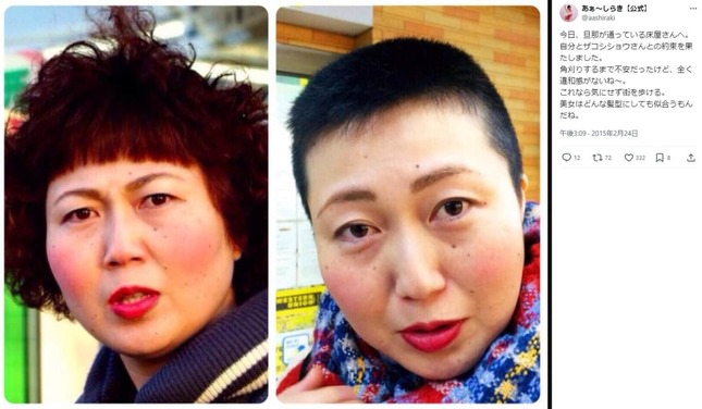 角刈り女芸人あぁ~しらき、「頭削れてる!」な寝癖にネット爆笑 「寝起きから笑わせようとしてますか?」