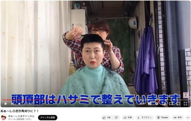また、しらきさんのYouTubeチャンネルでも、20年9月に「5年くらい前に撮ったものです」として、パーマヘアから角刈りにカットされる動画を公開している。