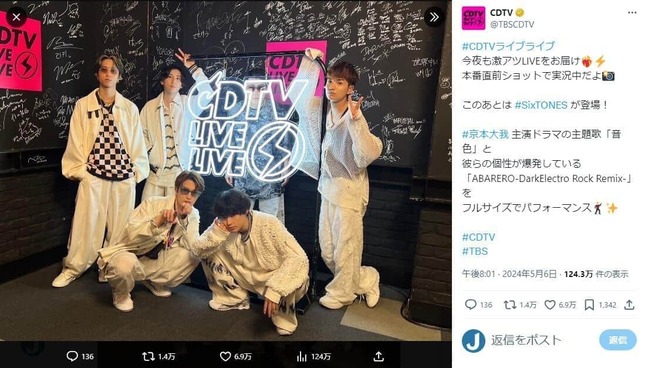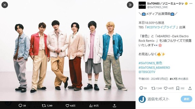 「SixTONES / ソニーミュージック」公式X(@SixTONES_SME)より