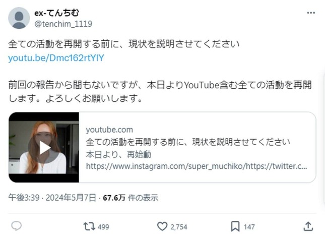 ユーチューバーの「てんちむ」こと橋本甜歌さん(30)が2024年5月7日、すべての活動を再開することをユーチューブのチャンネルで宣言した。