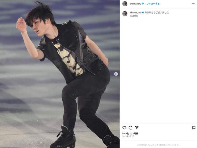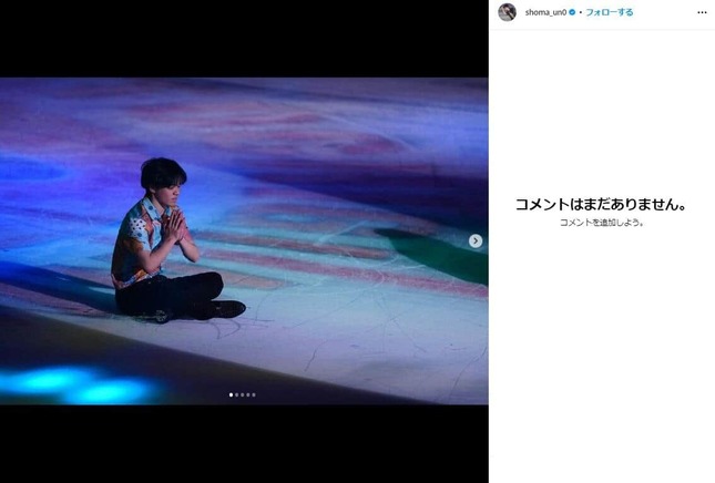 「Shoma!!! Uno!!! のコールって『キター!』って見てる人のわくわくが最高潮に達する瞬間だったと思うんですね」と振り返り、「それが競技会で聞けなくなるのはとても寂しいけれど、孤高の演技で長年楽しませてくれて本当に感謝です」と記した。