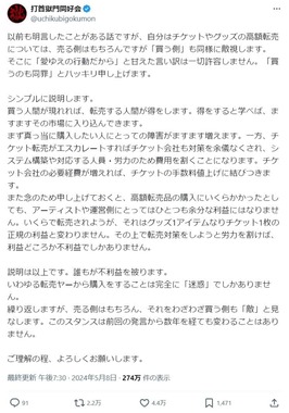 「また念のため申し上げておくと、高額転売品の購入にいくらかかったとしても、アーティストや運営側にとってはひとつも余分な利益にはなりません。いくらで転売されようが、それはグッズ1アイテムなりチケット1枚の正規の利益と変わりません。その上で転売対策をしようと労力を割けば、利益どころか不利益でしかありません」