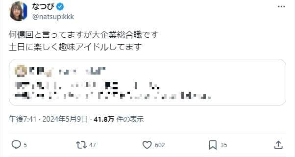 引用リポストで「東大卒地下ドルってほぼ高学歴ニートでしょ 夜職と張り合っちゃった時点でもう」とコメントされると、なつぴなつさんは「何億回と言ってますが大企業総合職です 土日に楽しく趣味アイドルしてます」と「高学歴ニート」を否定し、職業は「大企業総合職」だとした。