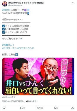 お笑いコンビ「とろサーモン」の久保田かずのぶさんと「ウエストランド」の井口浩之さんが進行するバラエティー番組「耳の穴かっぽじって聞け!」(テレビ朝日系)2024年5月7日深夜(8日未明)放送回の未公開トークが、8日にYouTubeチャンネル「動画、はじめてみました」で公開された。