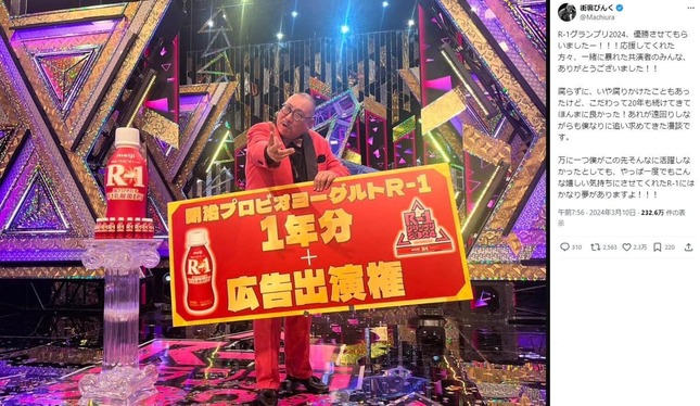 その中で、3月9日に決勝戦が行われたピン芸日本一決定戦「R-1グランプリ2024」で優勝したお笑い芸人の街裏ぴんくさんが、「R-1」優勝後の「悲しい現実」を明かした。