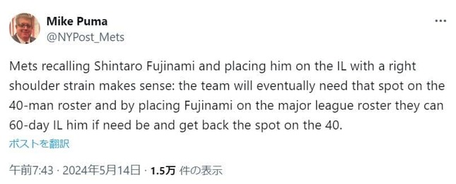 今回、メジャーに昇格させたうえで負傷者リスト入りとなったかたちだが、これは手続き上の措置。ニューヨークポスト紙のマイク・ピューマ記者は自身のXで「藤浪を負傷者リストに入れるのは理にかなっている。チームはいずれ40人ロースターの空きが必要になるだろうし、必要なら藤浪を60日間の負傷者リストに入れ、40人ロースターに空きを作ることができるからだ」と投稿。藤浪投手の負傷者リスト入りはロースターの観点からも合理的だと指摘した。