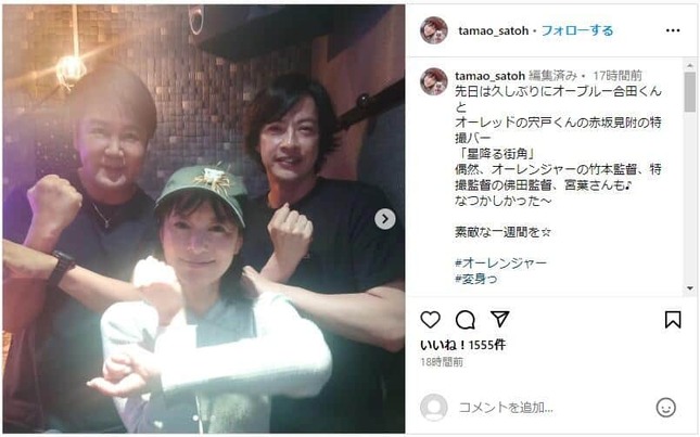 さとうさんはインスタグラムで「先日は久しぶりにオーブルー合田くんとオーレッドの宍戸くんの赤坂見附の特撮バー『星降る街角』」と、合田さんとともに、宍戸さんがプロデュースするバーを訪れたことを報告。3人で変身ポーズを決めているショットを公開した。