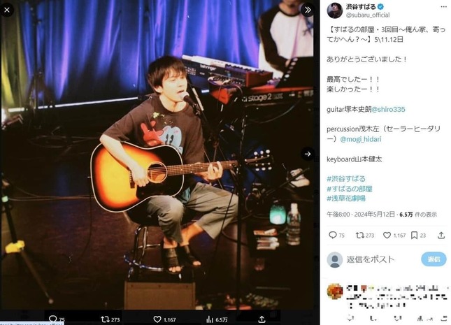2024年5月12日、渋谷さんは「すばるの部屋・3回目?俺ん家、寄ってかへん??」開催の感謝の言葉と共にイベント中の写真をXに投稿した。