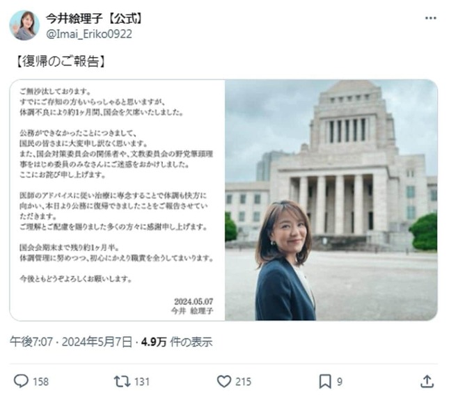 ゴールデンウィーク明けの7日、この新アカウントで今井氏は、国会前に立つ自身の写真を投稿し、「復帰のご報告」と題して、こう切り出した。