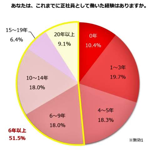 しゅふJOB総研の調査(2024年3月12日~19日)は就労志向のある既婚女性606人が対象。まず、正社員として働いた経験があるかを聞くと、9割近く(89.6%)が「ある」と答え、もっとも多かったのは「6年以上」(51.5%)だった【図表1】。