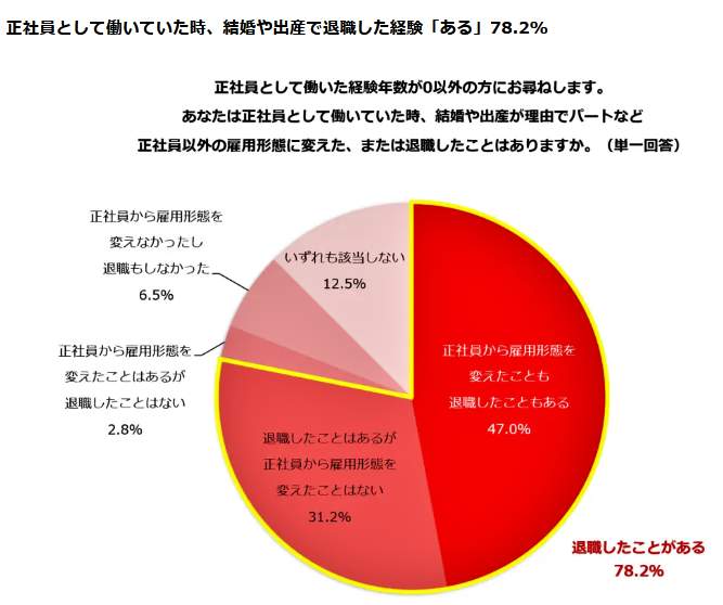 働く主婦・主夫層のホンネ調査機関「しゅふJOB総研」(東京都新宿区)が2024年5月9日に発表した調査「働く母に聞く 結婚・出産を機に『正社員』を辞めた経験は?」によると、正社員であることを辞めた「働くママ」は8割以上いることがわかった。