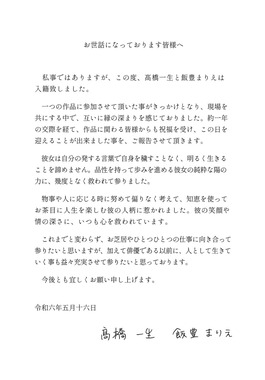 高橋さんと飯豊さんは、それぞれの所属事務所の公式ページで「私事ではありますが、この度、高橋一生と飯豊まりえは入籍致しました」と結婚を報告。「一つの作品に参加させて頂いた事がきっかけ」で、約1年間交際したことも明かした。