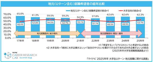 2025年卒の学生を対象とした調査で「地元就職希望」と答えた人が62.3%を占めた。地元(Uターン含む)就職希望者は2017年卒の65.0%から減少を続け、2021年卒では54.9%まで落ち込んでいた。