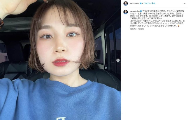 元レスリング選手で、2016年リオ五輪金メダリストの土性沙羅(どしょう・さら)さんが2024年5月12日にインスタグラムを更新し、初のウルフヘアーにしたことを報告した。コメント欄には「可愛い」の声が相次いでいる。