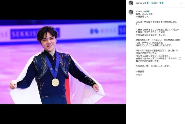 フィギュアスケートの宇野昌磨さんが2024年5月14日、都内で引退会見を行った。