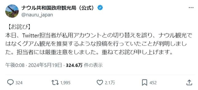 Xの「お詫び」は「本日、Twitter担当者が私用アカウントとの切り替えを誤り、ナウル観光ではなくグアム観光を推奨するような投稿を行っていたことが判明しました」という内容。