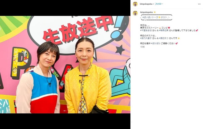 2024年5月15日放送の「ぽかぽか」(フジテレビ系)に、俳優の千堂あきほさん(55)と有森也実さん(56)がゲスト出演した。