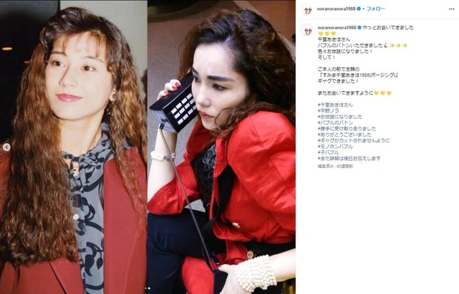 「ぽかぽか」では、千堂さんが平野ノラさんのネタをものまねすることに。千堂さんは、ソバージュヘアーに赤い服を着て「ジュリアナ扇子」を振りながら、荻野目洋子さんの曲「ダンシング・ヒーロー」に合わせて登場した。