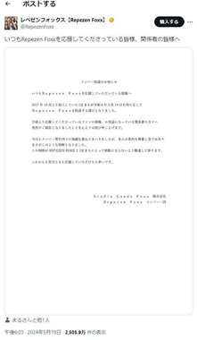 ファンや関係者に突然の報告を詫び、「今回もメンバー間社内での協議を重ねてまいりましたが、本人の意向を尊重し急ではありますがこのような判断となりました」と説明。「この判断がRepezenFoxxとDJまるにとって無駄にならないよう精進して参ります」と伝え、双方の応援を呼びかけている。