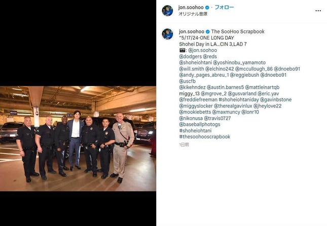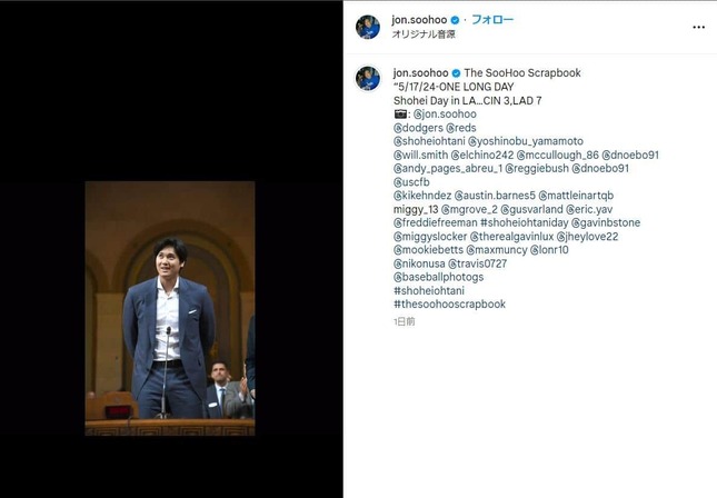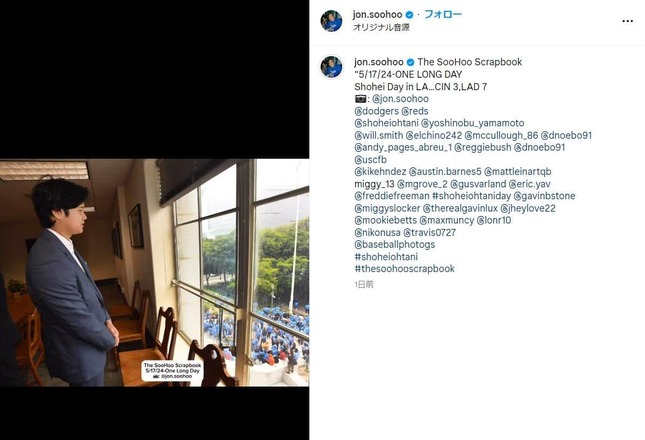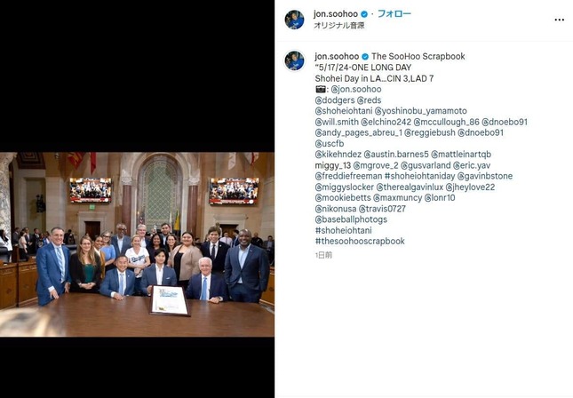ロサンゼルス・ドジャースの専属カメラマン、ジョン・スーフーさんが、2024年5月19日(日本時間)、大谷翔平選手がロサンゼルス市庁舎を訪れた際の写真をインスタグラムに公開した。