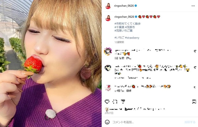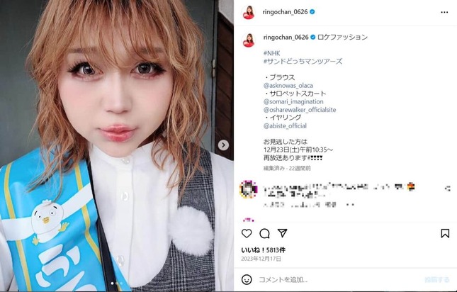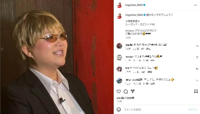りんごちゃんは「誰のモノマネでしょう?」とし、金髪に茶色いレンズのサングラス、黒いスーツを着用してニッコリ笑っている姿の写真を公開した。