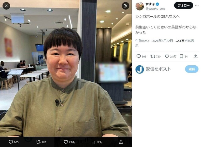 お笑い芸人のやす子さんが2024年5月22日にXを更新し、シンガポールで髪を切ったことを報告し、その写真を披露した。