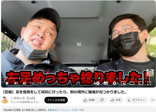 人気YouTuber「フィッシャーズ」のンダホさんが2024年5月23日、YouTubeで足を怪我して病院に行ったところ、かかとに腫瘍が見つかったことを明かした。