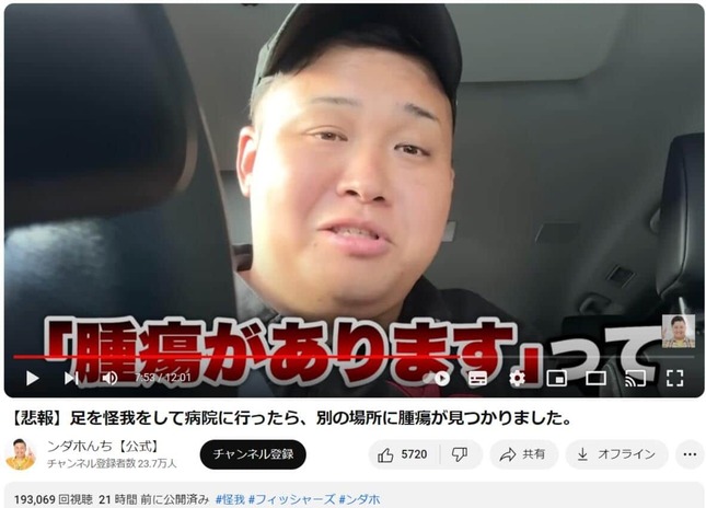 「【悲報】足を怪我をして病院に行ったら、別の場所に腫瘍が見つかりました」と題した動画を投稿。