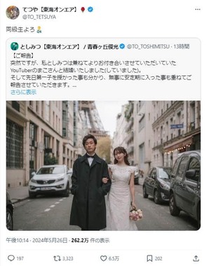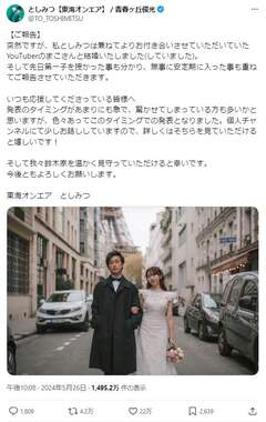 ウェディングフォトを添え、「突然ですが、私としみつは兼ねてよりお付き合いさせていただいていたYouTuberのまこさんと結婚いたしました(していました)。そして先日第一子を授かった事も分かり、無事に安定期に入った事も重ねてご報告させていただきます」とした。