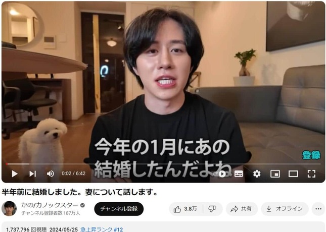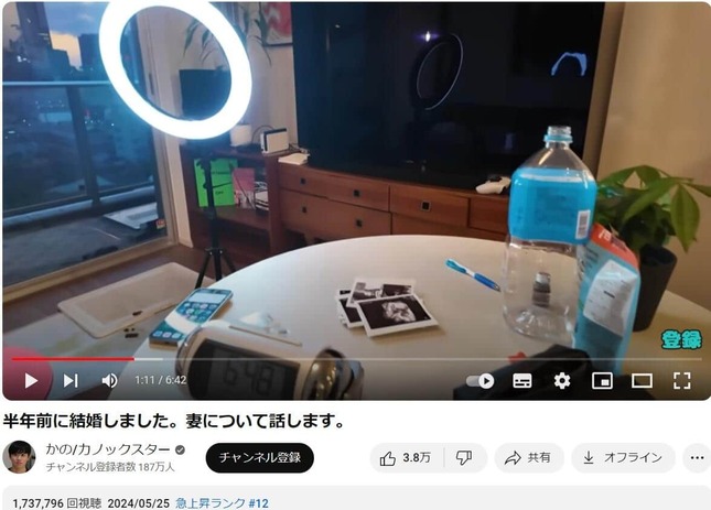 チャンネル登録者数187万人超の人気YouTuber「カノックスター」(かの)さんが2024年5月25日、YouTubeで24年1月に結婚していたことを明かした。動画にエコー写真が写り込んでおり、「エコー写真ある!!!結婚と赤ちゃんおめでとう」「結婚どころかパパになるんじゃない」と話題となっている。