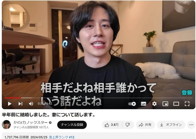かのさんは「実は今年の1月に結婚したんだよね」と切り出し、相手については「表に出てない人と結婚したから、(誰かは)わからないと思う。これから登場したりとかしてくれるかはわからないけど」と語った。