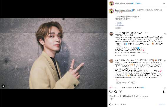 宮世さんは24年5月3日、「ガールズアワードありがとうございました!」と綴り、インスタグラムを更新。この出演したイベント「Rakuten GirlsAward 2024 SPRING/SUMMER」のバックステージショットを公開した。写真に写る宮世さんの流し目ピース姿に、「毎度毎度ビジュが爆発」、「りゅびさんほんとに爆イケ」などのコメントが寄せられた。