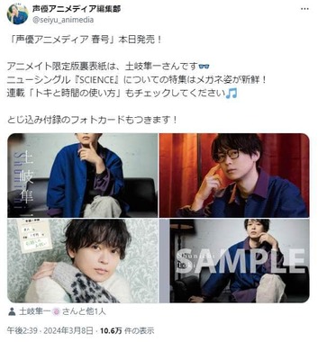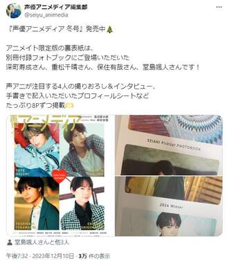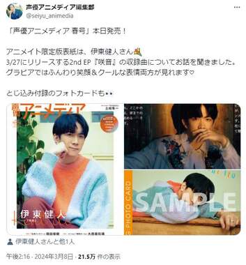続く投稿では、「現在全力で6/10発売の『声優アニメディア 夏号』の制作にあたっております。6/3頃に表紙や特典の画像も解禁予定なので、楽しみにお待ちください」と呼びかけた。
