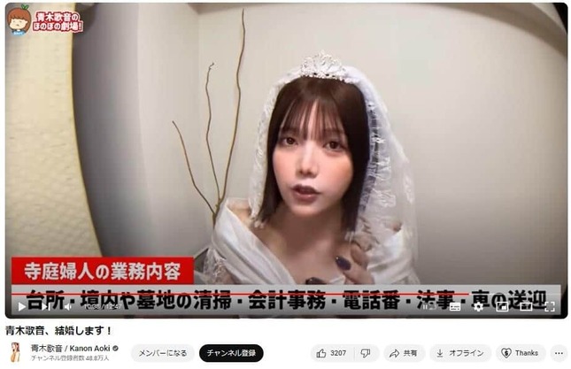 青木さんはウェディングドレス姿で動画に登場し、まず自身が「性分化疾患」のためXXYの染色体を持っており、生殖能力はないなどとする自らの状況を説明した。その流れで、後半では、実家がお寺だという過去の交際相手とのエピソードを振りかえった。