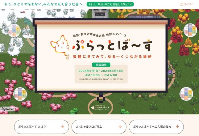 孤独・孤立対策強化月間の2024年5月1日~31日、内閣府はメタバース(仮想空間)「ぷらっとば~す」を開設している。孤独・孤立の問題を抱える当事者やその周囲の人など、誰もが気軽に立ち寄れる空間を目指している。