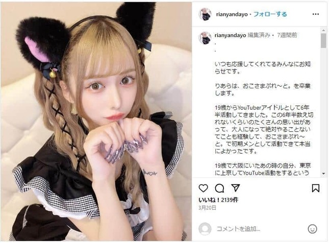 アイドル兼YouTuberの「おこさまぷれ~と。」を卒業目前で脱退となった「りあら」さんが2024年5月29日、グループ脱退から約1か月半ぶりにXを更新した。その内容に、心配の声が相次いでいる。