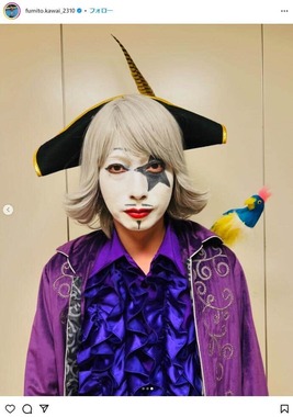 河合郁人さんは、29日放送の「FNS鬼レンチャン歌謡祭」(フジテレビ系)に、ゴー☆ジャスさんの姿に扮して出演。フリルをふんだんに使った紫色の衣装を着て、顔を白く塗り、左目の周りに黒い星のマークを描いた、ゴー☆ジャスさんの独特な服装やメイクを忠実に再現している写真を「ゴージャス河合。」というコメントとともに投稿した。