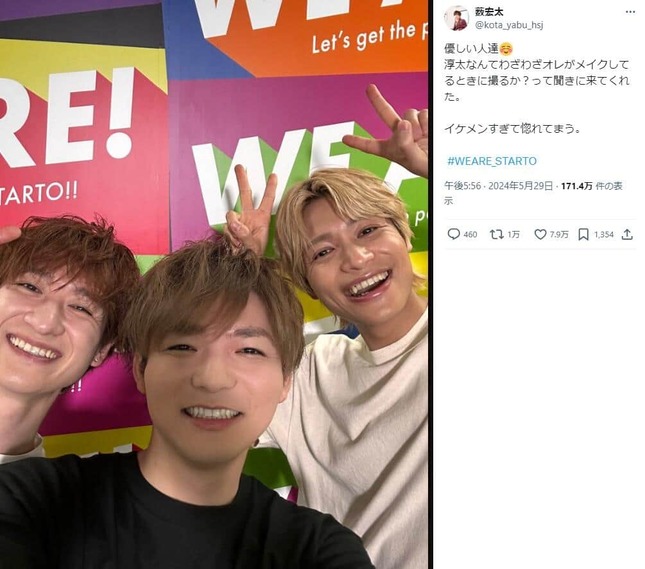 そして中間さんのリプライから約1時間後、薮さんがXで宮田さん、中間さんとの3ショットを公開した。薮さんは「優しい人達 淳太なんてわざわざオレがメイクしてるときに撮るか?って聞きに来てくれた。イケメンすぎて惚れてまう」とのコメントを添えた。