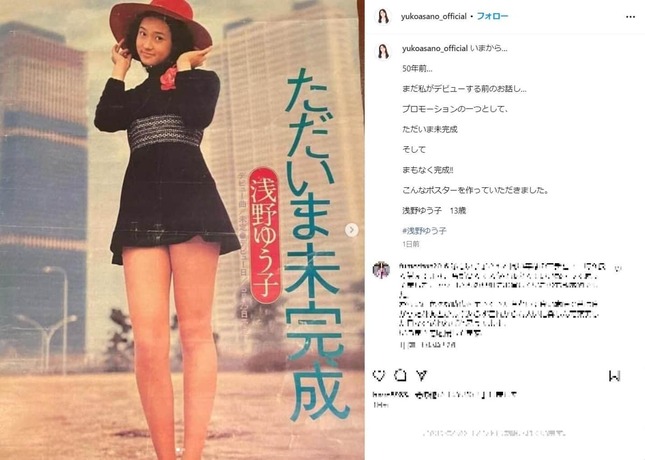 「50年」というのは、デビュー50周年のことを指しているようだ。浅野さんは5月25日のインスタグラム投稿でも、「50年前の今日 1974年 5月25日 【とびだせ初恋】 という曲でRCAレコードからデビューさせていただきました!!」と話題にしていた。13歳でのデビューだった。
