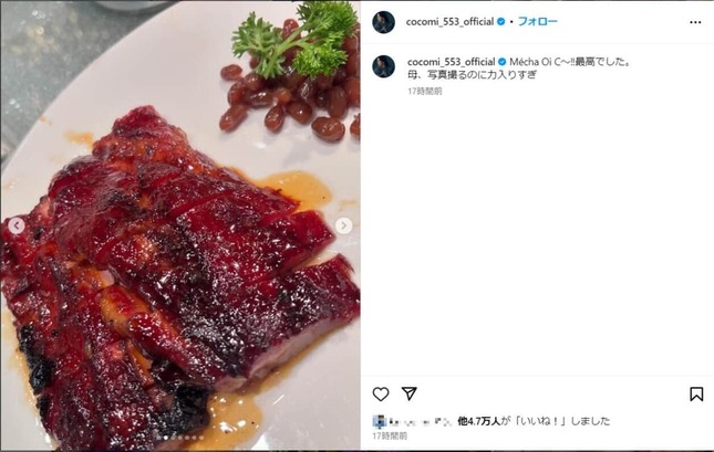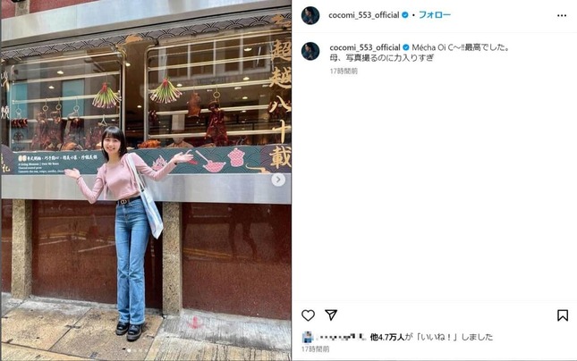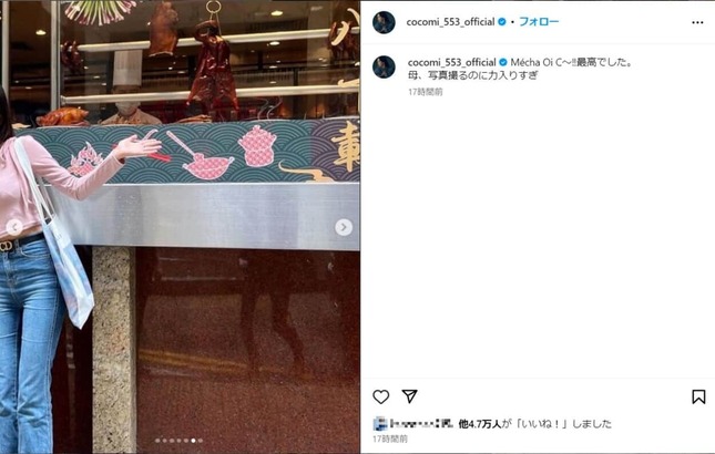 Cocomiさんは「Mecha Oi C〜‼️最高でした。母、写真撮るのに力入りすぎ」とコメントし、中華料理屋の前で撮影した自身の写真や、料理の写真を公開した。