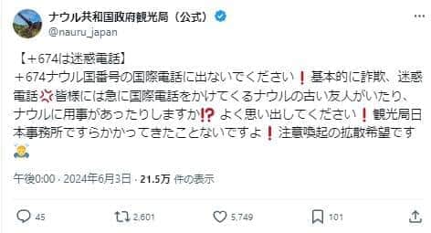 ハワイとオーストラリアの間にある小さな島国、ナウル共和国の政府観光局日本事務所の公式Xアカウントが2024年6月3日、Xで迷惑電話に関する注意喚起を行った。