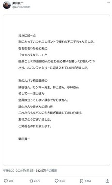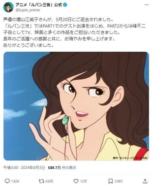 昭和の名ヒロインの訃報に、SNSでは「セクシーでキュートで華やかで それでいて頭がキレて 誰にも縛られない 増山さんが演じた峰不二子が大好きでした」「江威子さん... ほんと素敵な声で 歌も上手くて色んな作品で楽しませて貰いました 俺ら世代のスター!!」など悲しみの声が相次いだ。