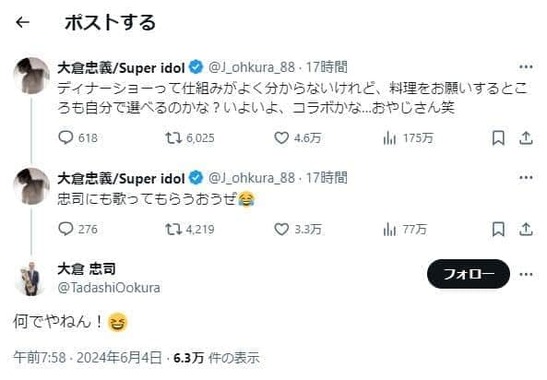 「SUPEREIGHT」(旧関ジャニ∞)の大倉忠義さんが2024年6月3日、同日に開催が発表された自身のソロイベントについて、父との「コラボ」をXで示唆した。