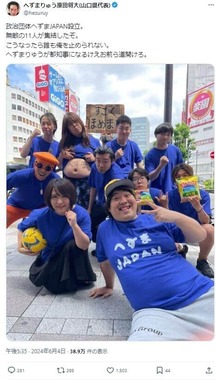 へずまさんはXで「政治団体へずまJAPAN設立」とつづり、自身と自身の妻を含めた10人で路上にて撮影した写真を公開。「無敵の11人が集結したぞ。こうなったら誰も俺を止められない」とつづり、「へずまりゅうが都知事になるけえお前ら道開けろ」と宣言した。